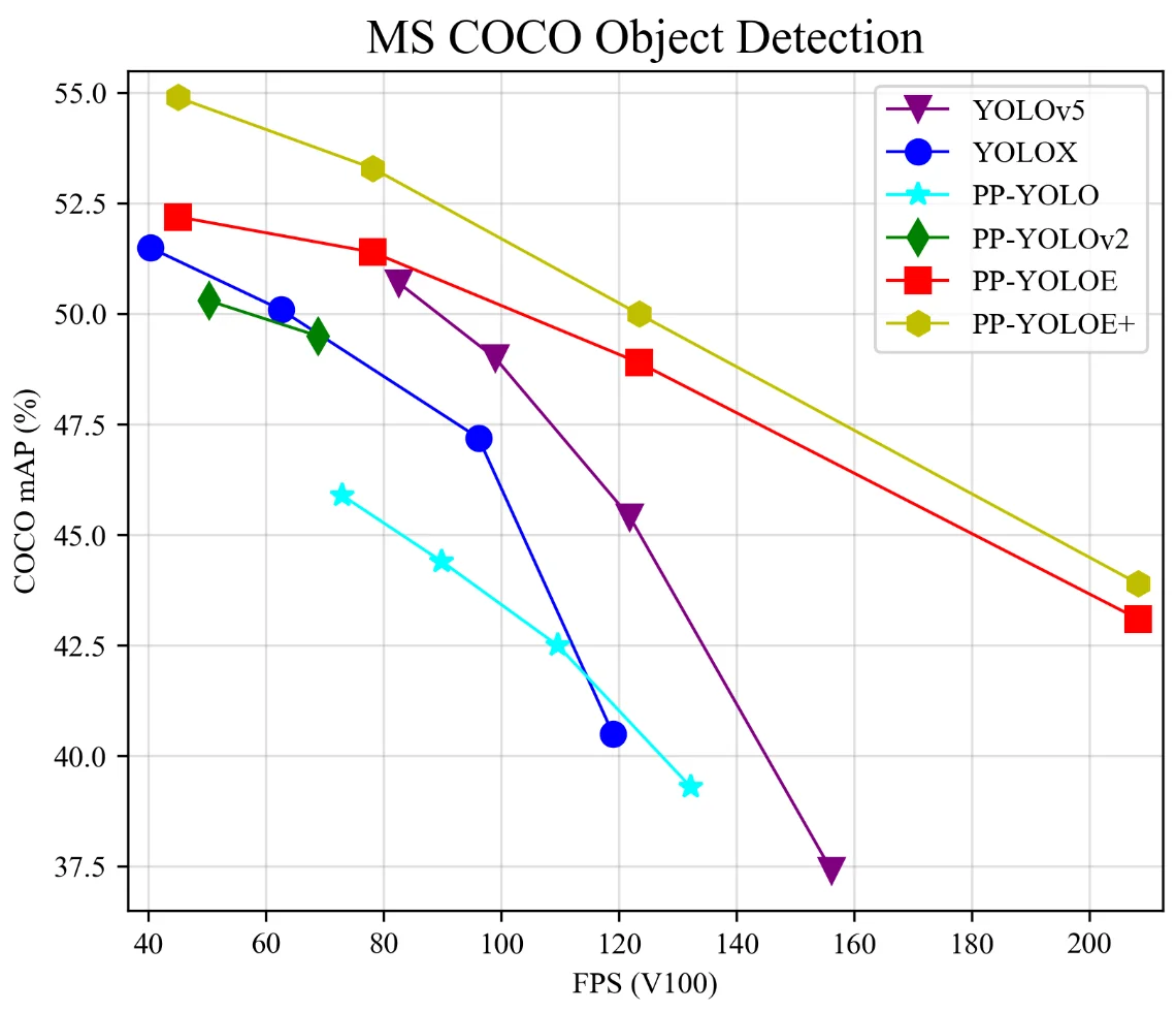 PP-YOLOE+ HOUYI mainly uses PP-YOLOE+ as the online inference model. PP-YOLOE+ is an excellent one-stage anchor-free model based on PP-YOLOv2. Its accuracy-fps tradeoff surpasses many popular YOLO variants. On top of that, PP-YOLOE+ converges in only 80 epochs, which greatly reduces training time and cost compared with the more common 300-epoch setting.